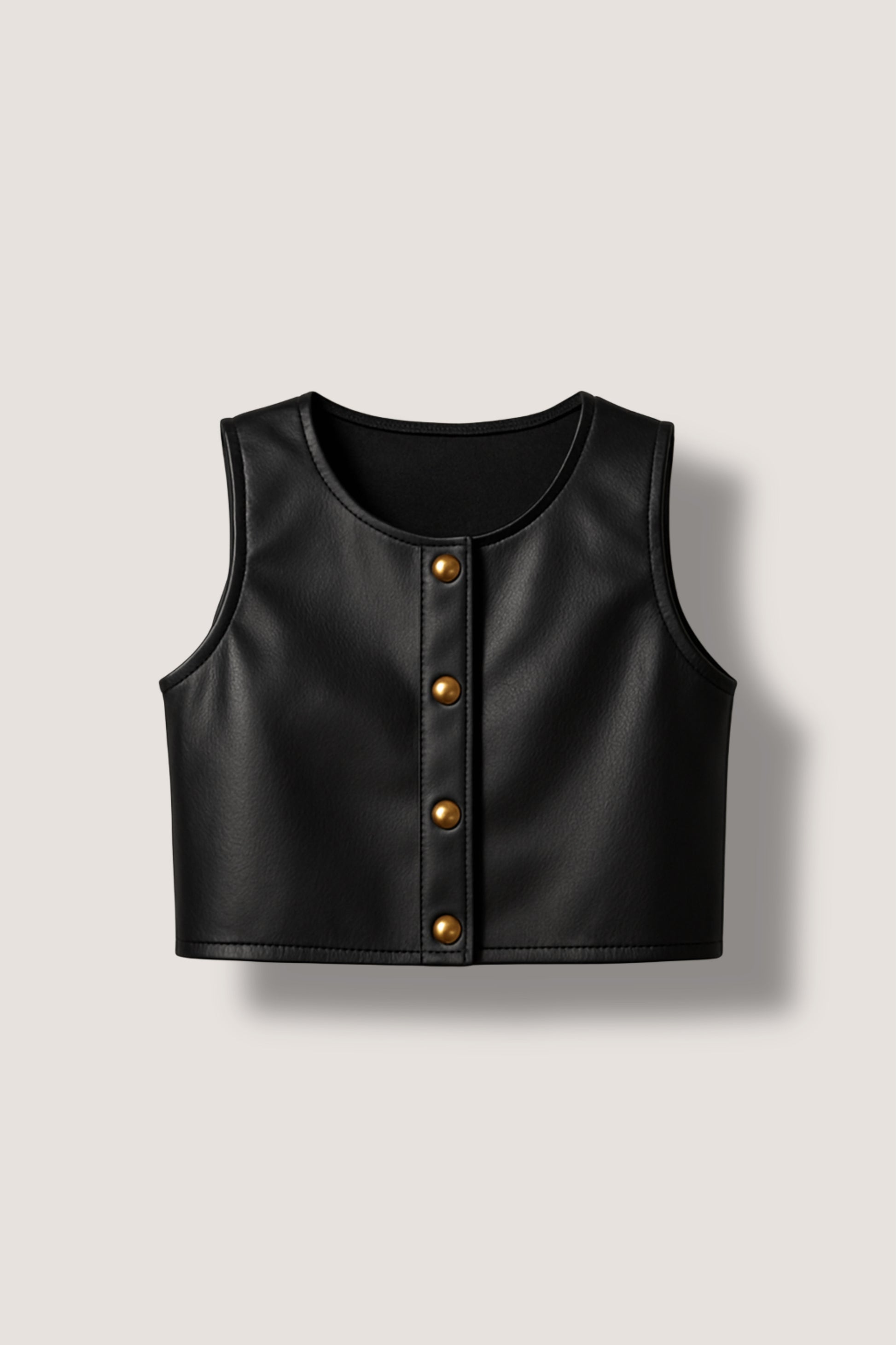 Chaleco en cuero sintético con detalles de botones dorados.