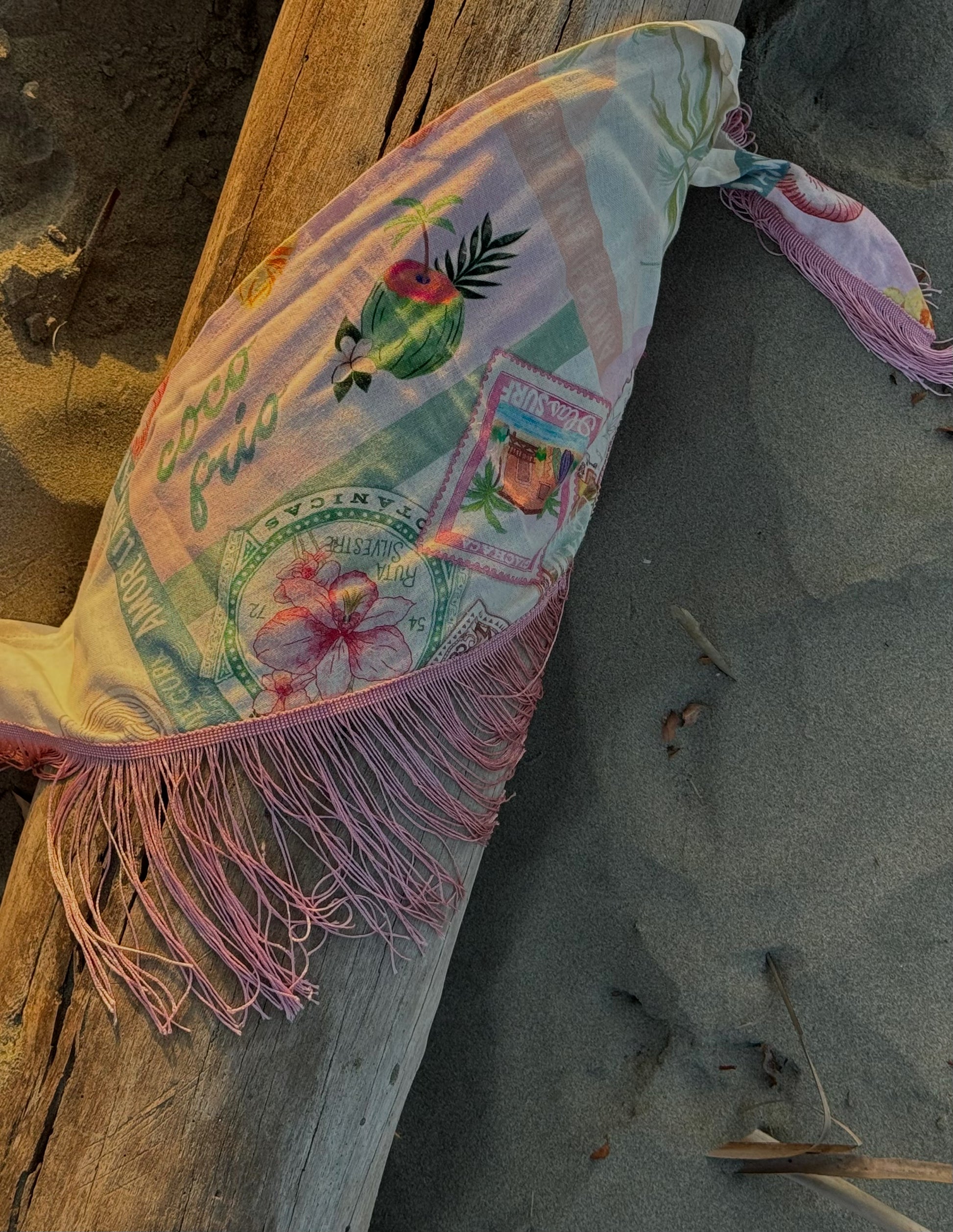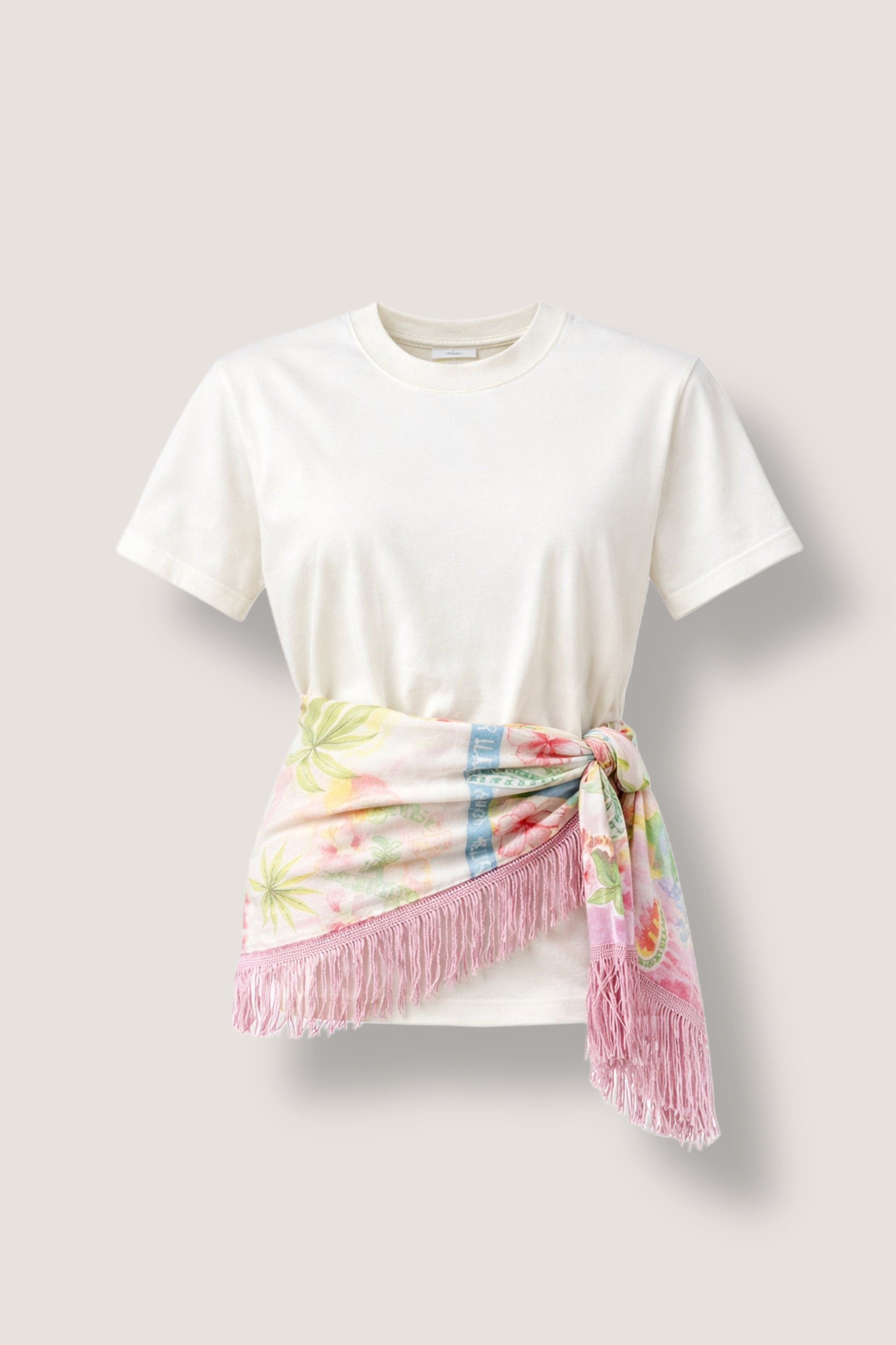 Una camiseta en algodón color marfil con una silueta limpia y relajada, elevada por una pañoleta en lino estampado que se anuda en la cintura y termina en delicados flecos rosados que se mueven con cada paso.