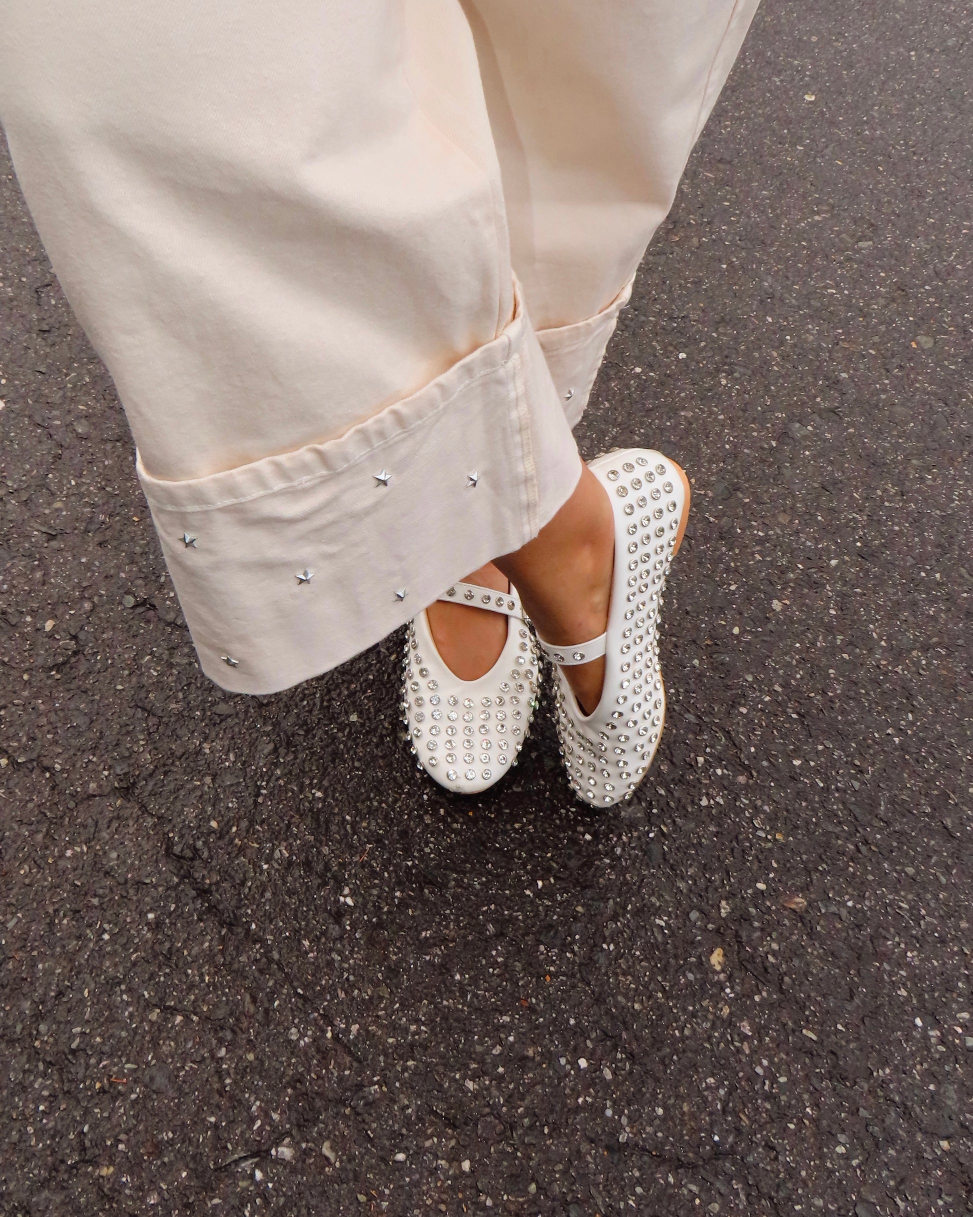 Jeans color arena tiro medio en denim rídigo con remaches de estrella en bolsillos y botas delanteras y lavado efecto degradé.