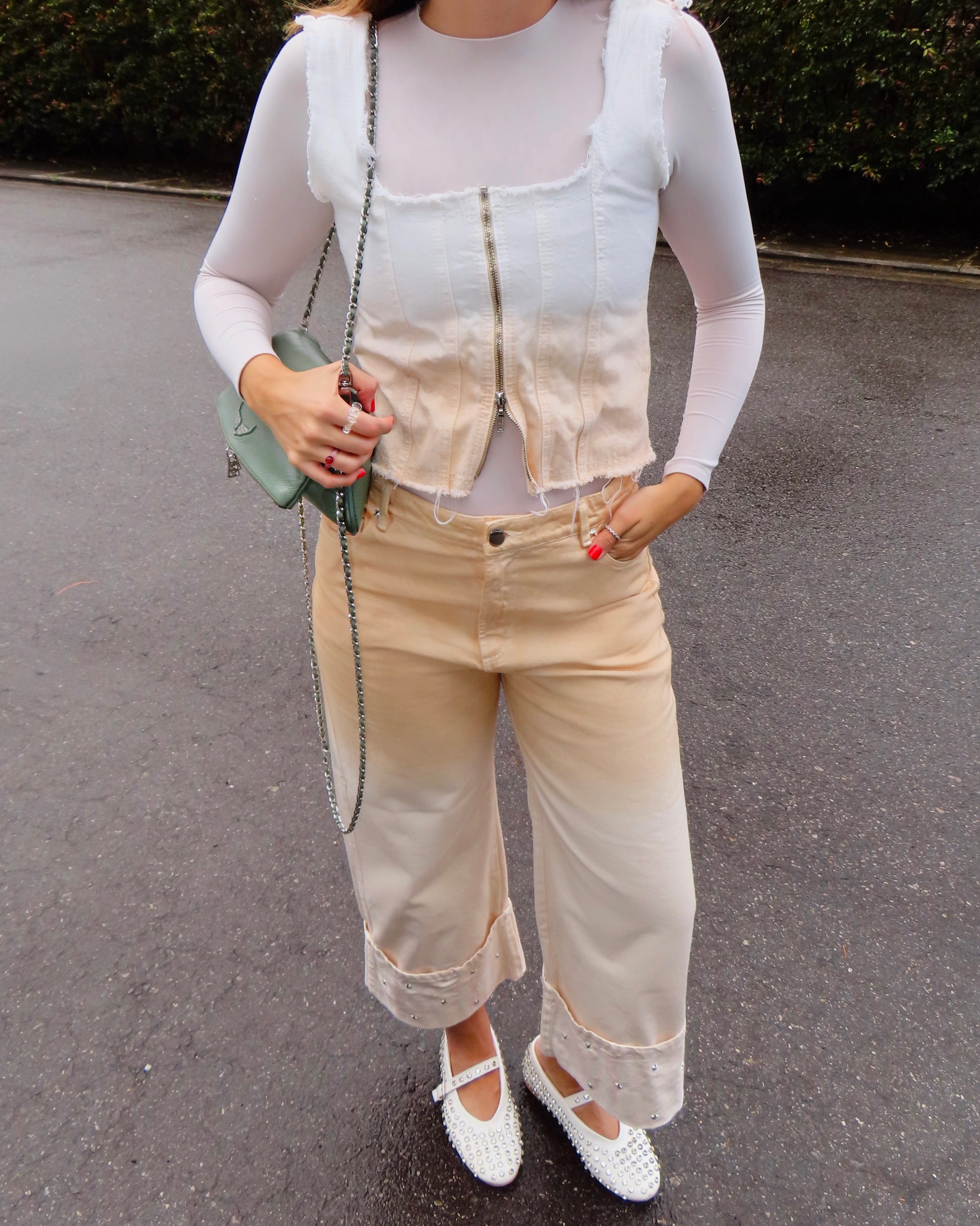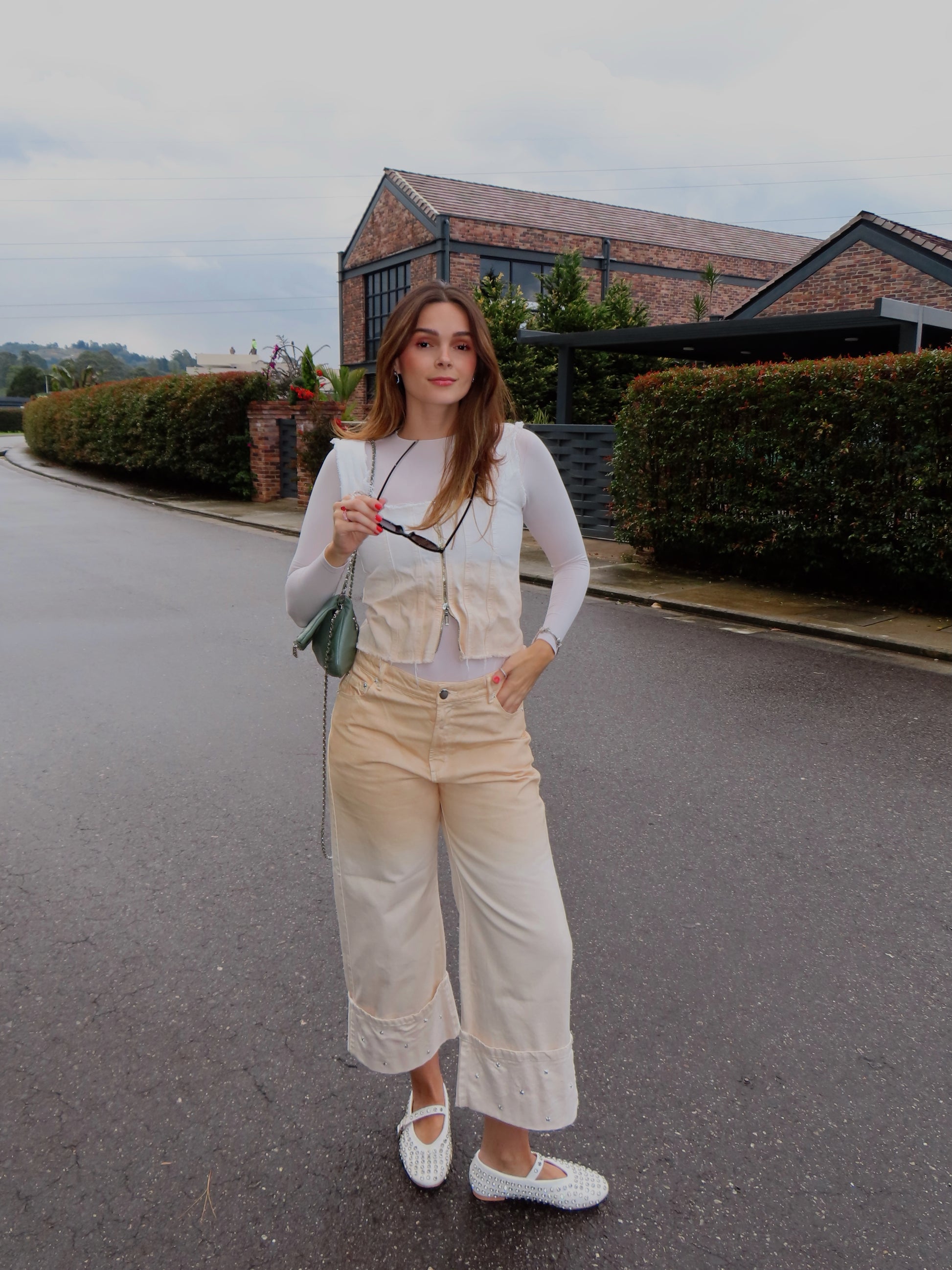 Cami mide 1.75 m, normalmente usa talla 10 pero aquí tiene una talla 12 para que le quede low waist.